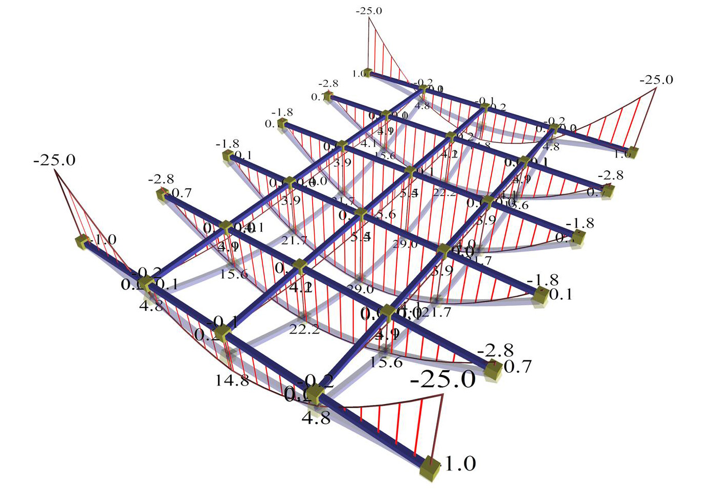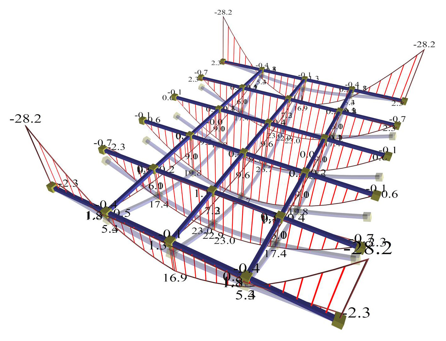 Η παραδοσιακή στατική επίλυση θεωρεί τις δοκούς πρακτικά απαραμόρφωτες. Σήμερα, με την ακριβέστερη επίλυση με πεπερασμένα στοιχεία, είμαστε σε θέση να δημιουργούμε φορείς με σημαντικά ισχυρότερη δυσκαμψία δοκών έναντι πλακών. Προκειμένου να μελετήσουμε την επίδραση της κατακόρυφης παραμόρφωσης των δοκών στήριξης, διερευνήσαμε παραμετρικά το ύψος τους (1000, 500, 300 mm). Και στις δύο προσομοιώσεις, η επιρροή των βυθίσεων δοκών στην παραμόρφωση της πλάκας είναι σχεδόν μηδενική για διατομή δοκών 300/1000 (παραμορφώσεις δοκών πρακτικά μηδενικές), μέτρια για 300/500 (σημαντικά μικρότερες σε σχέση με τις αντίστοιχες πλάκας) και σημαντική για 300/300 (σημαντικές). Στην προσομοίωση με επιφανειακά πεπερασμένα στοιχεία, οι δευτερεύουσες ροπές κάμψης είναι πάντοτε σημαντικές, ενώ οι ροπές προς την κύρια διεύθυνση παραμένουν σχετικά σταθερές.